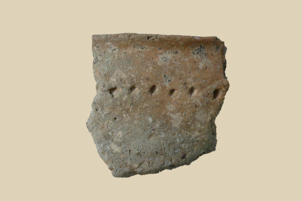 Orlo everso, bordo arrotondato, parete convessa, mancante di fondo. Nel punto di massima espansione è presente una decorazione impressa ad una serie orizzontale di punti. Ceramica eseguita a mano. Diametro ricostruito 12 cm