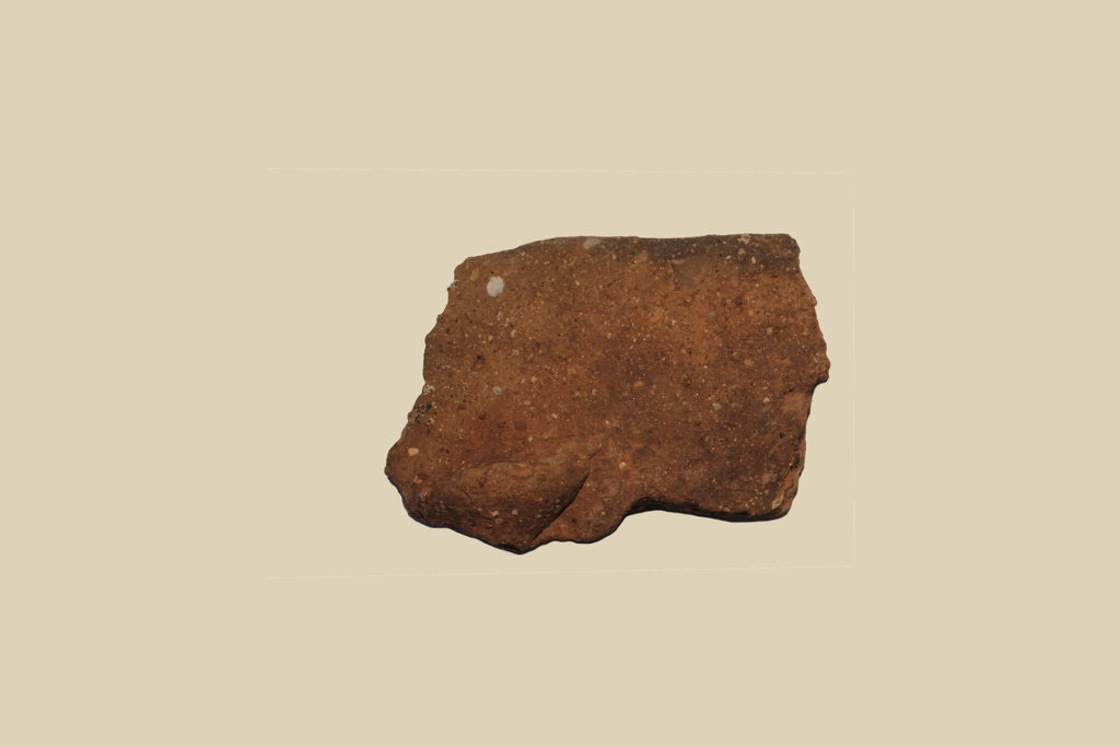 Orlo indistinto, bordo appiattito inclinato all’interno, parete convessa, mancante di fondo. Sulla parete è presente una piccola presa a lingua a sezione semicircolare. Ceramica eseguita a mano. Diametro ricostruito 33 cm