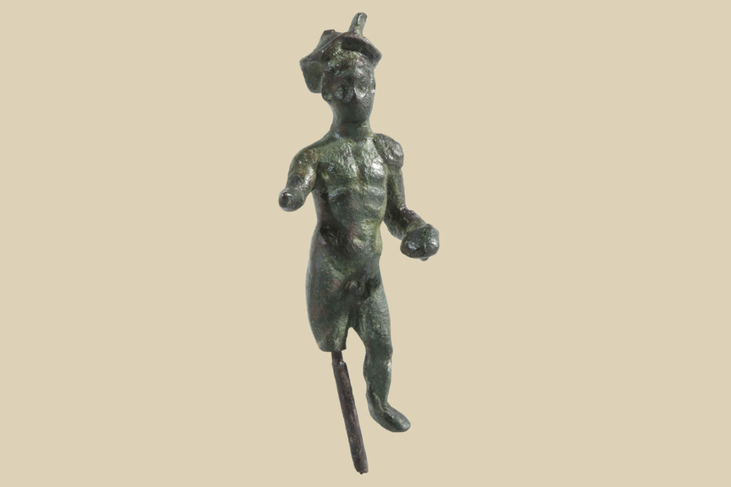 Statuetta di Mercurio Psicopompo in posizione stante con la gamba sinistra flessa e arretrata, sulla quale sono visibili due ali sporgenti dalla caviglia, e la destra frammentaria. Sul braccio sinistro poggia la clamide che ricade dalla spalla e nella mano regge una tartaruga. Sul capo porta il pedaso alato. Tecnica a fusione piena