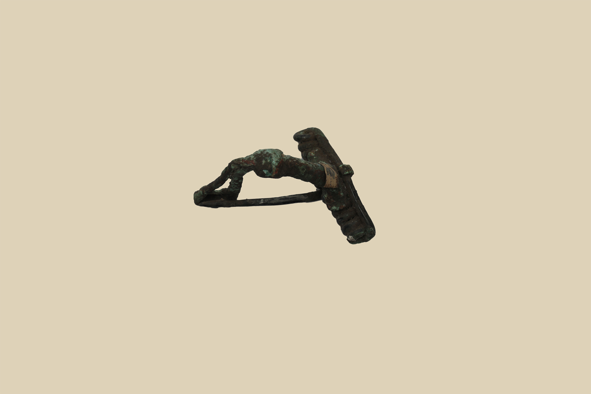 Fibula in bronzo a balestra tipo Ettlinger 6: a lunga spirale con sei avvolgimenti per lato, staffa prolungata che si salda alla sommità dell’arco