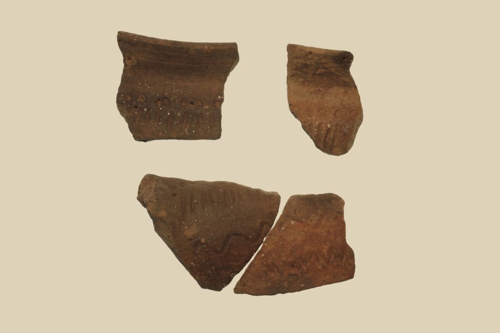 Orlo leggermente everso, spalla arrotondata, parete convessa, mancante di fondo. Sulla parete è presente una decorazione incisa e impressa su più registri: il superiore è costituito da cerchielli impressi che sormontano brevi tratti verticali incisi. il secondo è costituto da una linea ondulata incisa ed infine da brevi tratti incisi, obliqui formanti motivi angolari. Mancante di fondo. Ceramica eseguita a tornio. Diametro ricostruito 17 cm