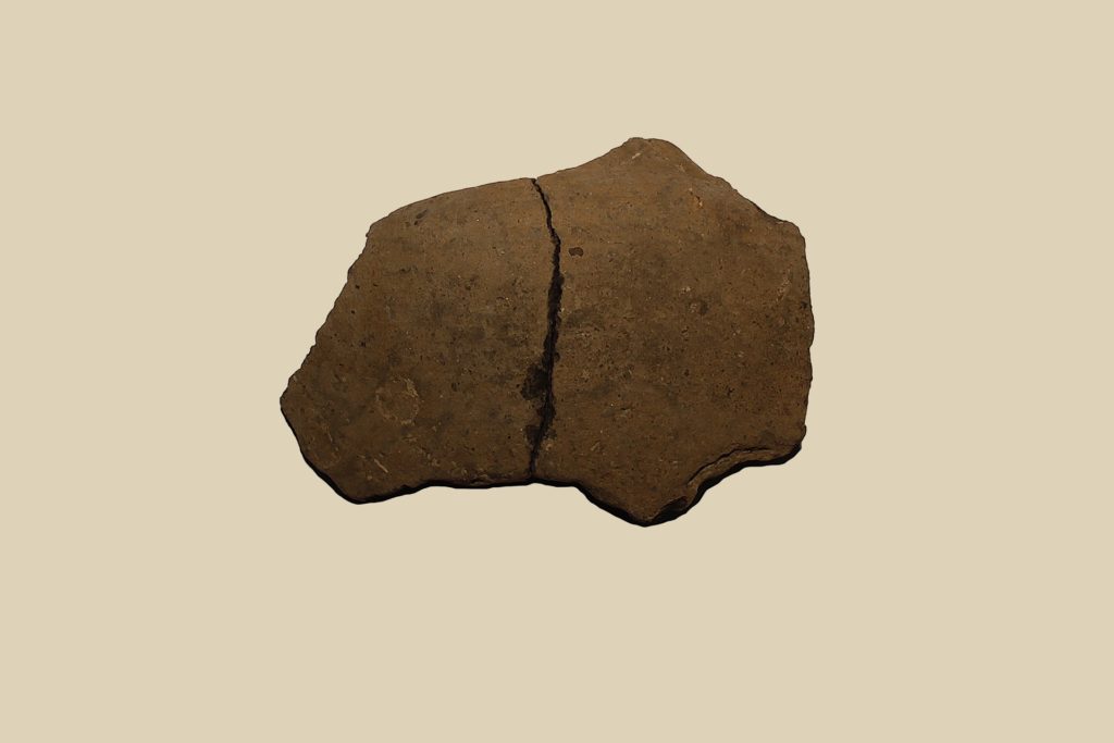 Piccolo vaso mancante di orlo, parete superiore a profilo dritto, spalla arrotondata, vasca a profilo convesso, mancante di fondo. Il tronco superiore è decorato da brevi solcature oblique formanti motivi ad angoli alterni. Ceramica eseguita a mano. Diametro ricostruito 16 cm