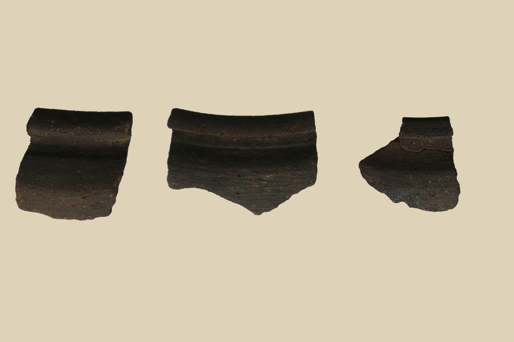 Si conservano alcuni frammenti di orli ripiegati all’esterno con breve spalla e parete convessa spesso lisciata a spazzola. Ceramica eseguita a tornio