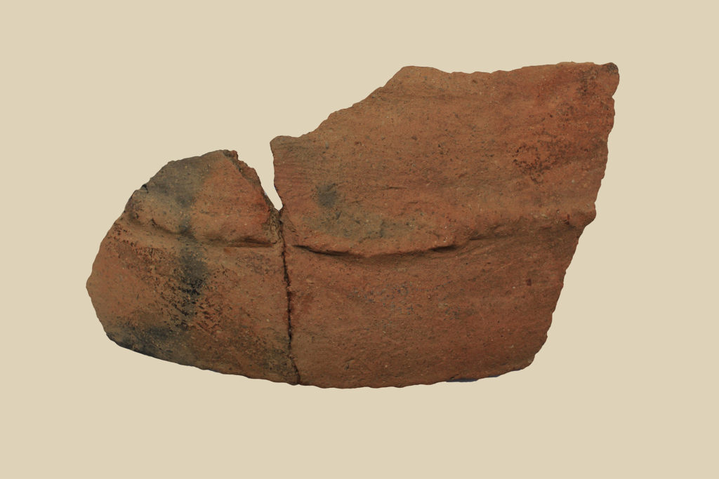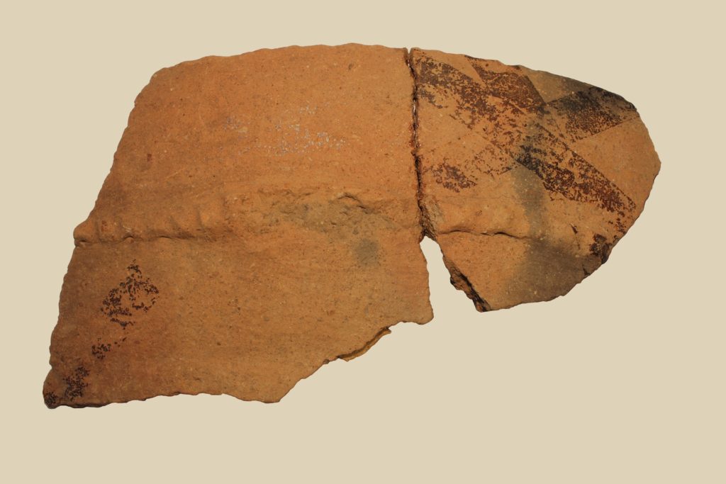 Orlo indistinto a bordo appiattito decorato con tacche, parete convessa, mancante di fondo. Sulla parete è presente una decorazione plastica a cordone orizzontale, con profonde tacche, desinente in una probabile presa. Ceramica eseguita a mano. Diametro 45 cm
