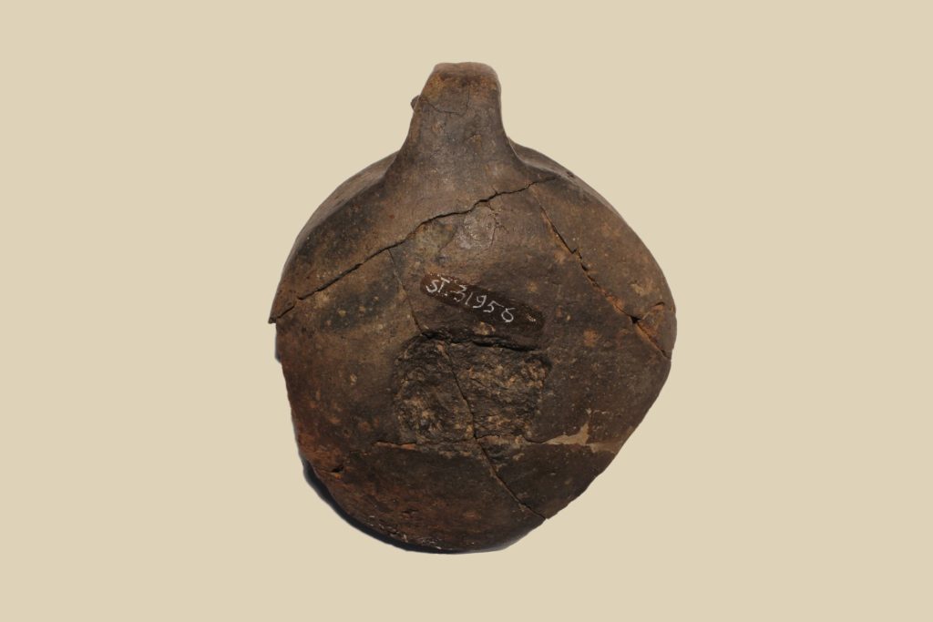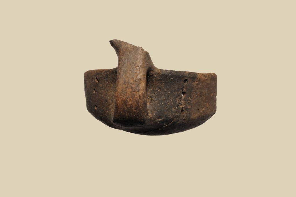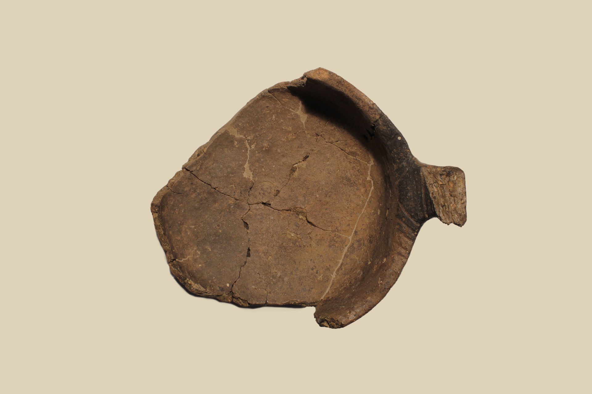 Orlo indistinto, carena arrotondata, vasca e fondo convessi. La parete, ai lati dell’ansa, presenta sei piccoli fori passanti. Tra orlo e carena è impostata un’ansa, probabilmente con estremità tronche, decorata all’attacco da almeno tre solcature orizzontali, mentre cinque brevi solcature oblique ornano il bordo dell’orlo. Ceramica eseguita a mano. Diametro ricostruito 10 cm