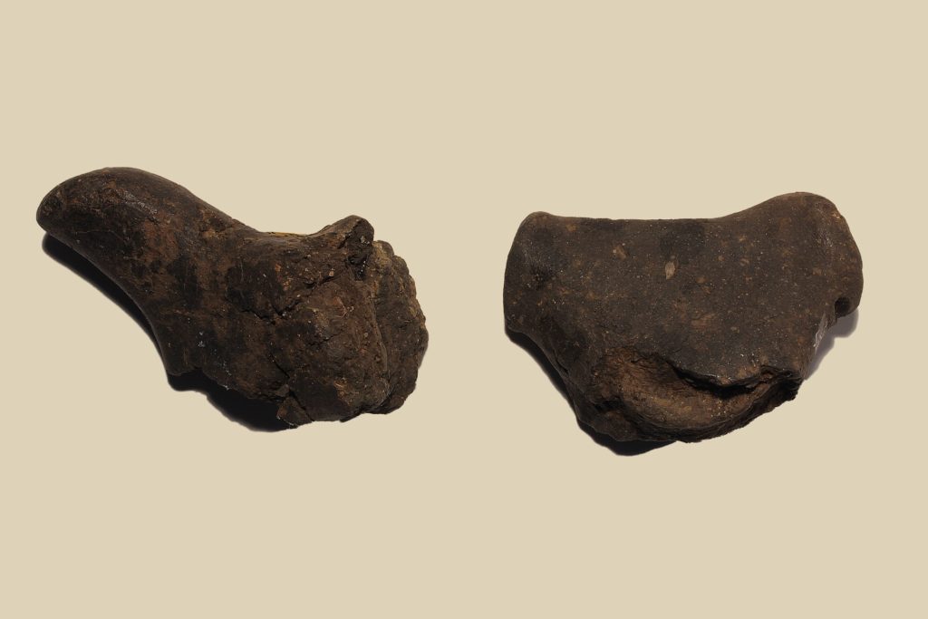 Anse sopraelevate con appendici coniche e tronche. L’esemplare con appendici tronche presenta una decorazione a lievi scanalature oblique formanti un motivo angolare sulla faccia interna. Ceramica eseguita a mano