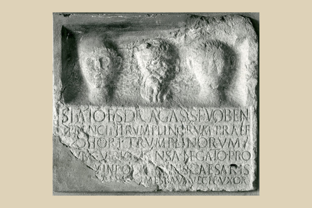 Staius viene definito princeps dei Triumplini e comandante di una corte di soldati locali, ma agli ordini del legato pro pretore che operava nella vicina Vindelicia (regione dell’attuale Austria). Staius ed Esdragassus come Messava e Vecus sono nomi indigeni declinati alla latina: si tratta di personaggi locali ormai assorbiti nella sfera romana; Voben(ati) o Voben(o) è un nome di luogo o derivato da un luogo, uno dei pagi ricordati dall’epigrafia bresciana e da riconoscere nell’attuale Bovegno. Incertezze sulla figura di C.Vibio Pansa da identificare con il console del 43 a.C. (Mommsen) o con il figlio dello stesso che fu propretore e legato di Augusto (Albertini): nel primo caso l’epigrafe si data anteriormente al 42 a.C, nel secondo dopo il 15 a.C. Riguardo all’immunità dai tributi concessa dall’imperatore non è frequente la menzione nelle epigrafi e può riguardare l’esenzione dalle imposte, dal servizio militare o dall’esercizio delle cariche pubbliche. Nell’incavo sono raffigurati tre ritratti: al centro un uomo barbuto e ai lati una donna e forse un adolescente.