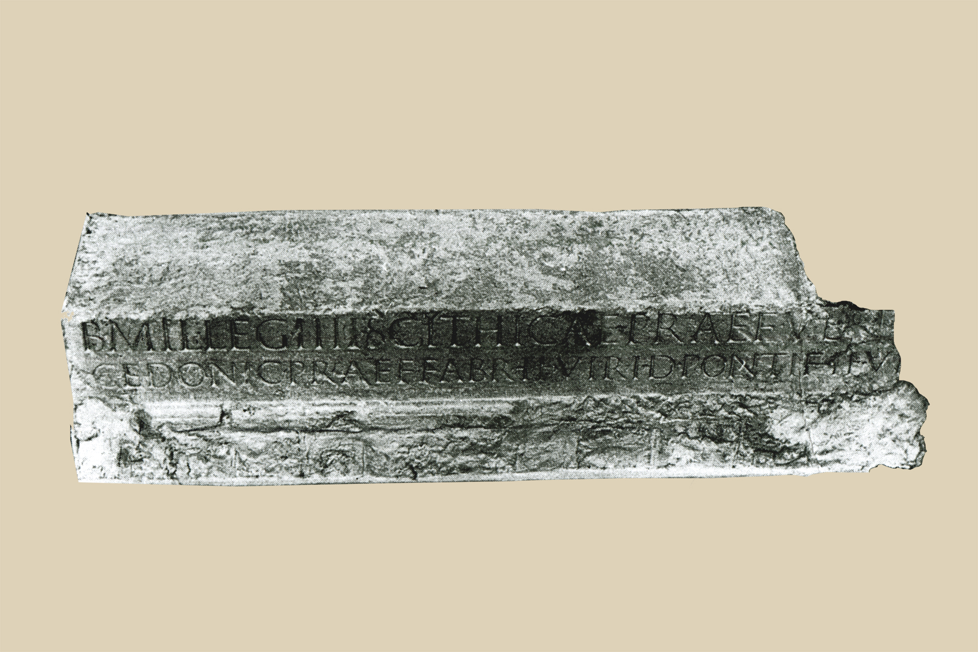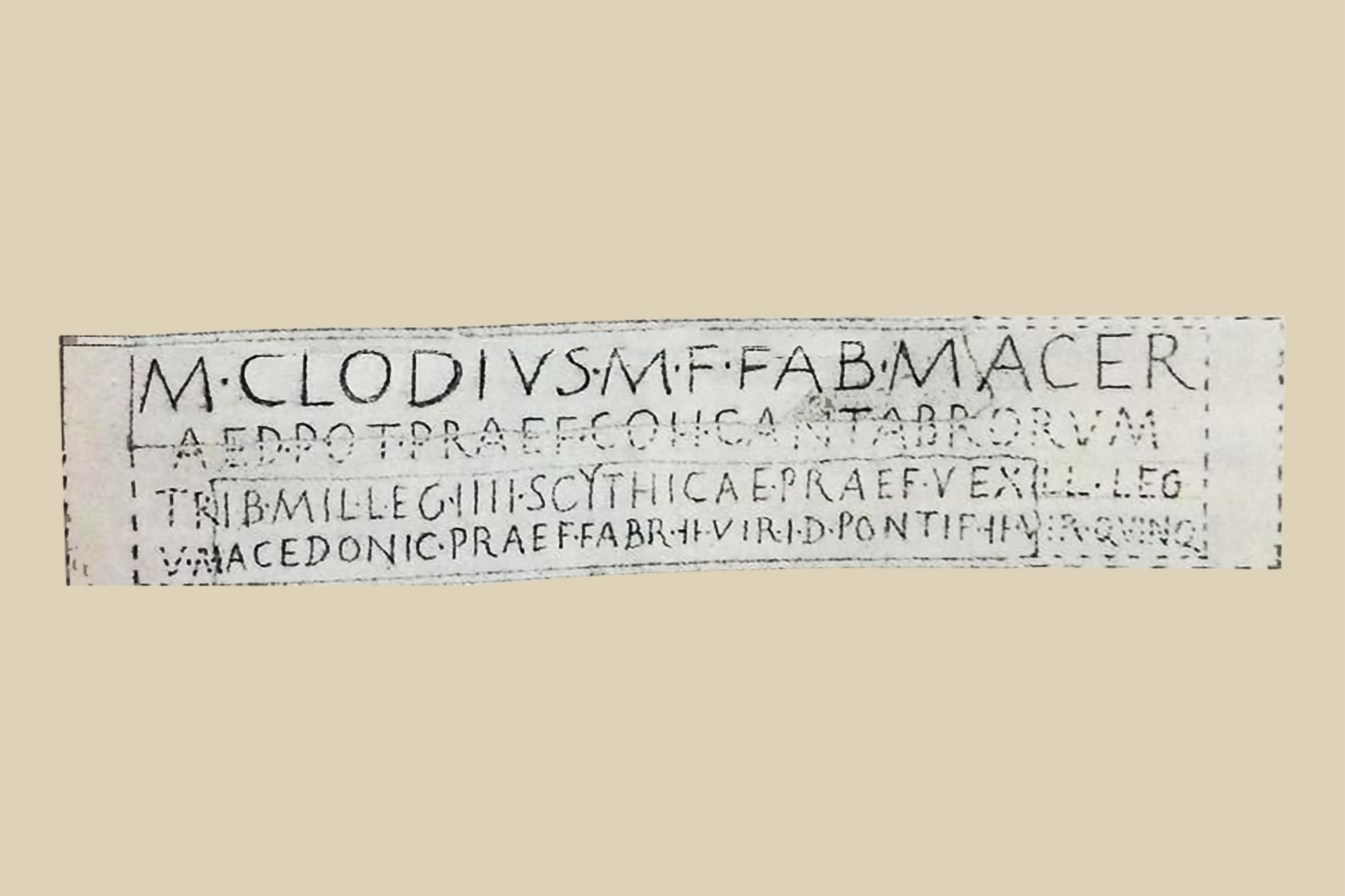 Traduzione: Marco Clodio Ma(…) figlio di Marco, della tribù Fabia, rivestito della carica di edile, prefetto della coorte dei Cantabri, tribuno dei soldati della quarta legione scitica, prefetto dei vessillari della quinta legione macedonica, capo dei soldati del genio, duoviro (supremo magistrato), pontefice, duoviro quinquennale
