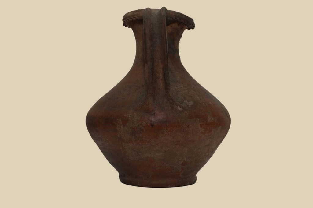 Brocca ad orlo ingrossato e a tesa, decorato esternamente da brevi linee oblique incise, collo svasato, corpo biconico, basso piede ad anello. Ansa a nastro scanalato impostata tra orlo e corpo.