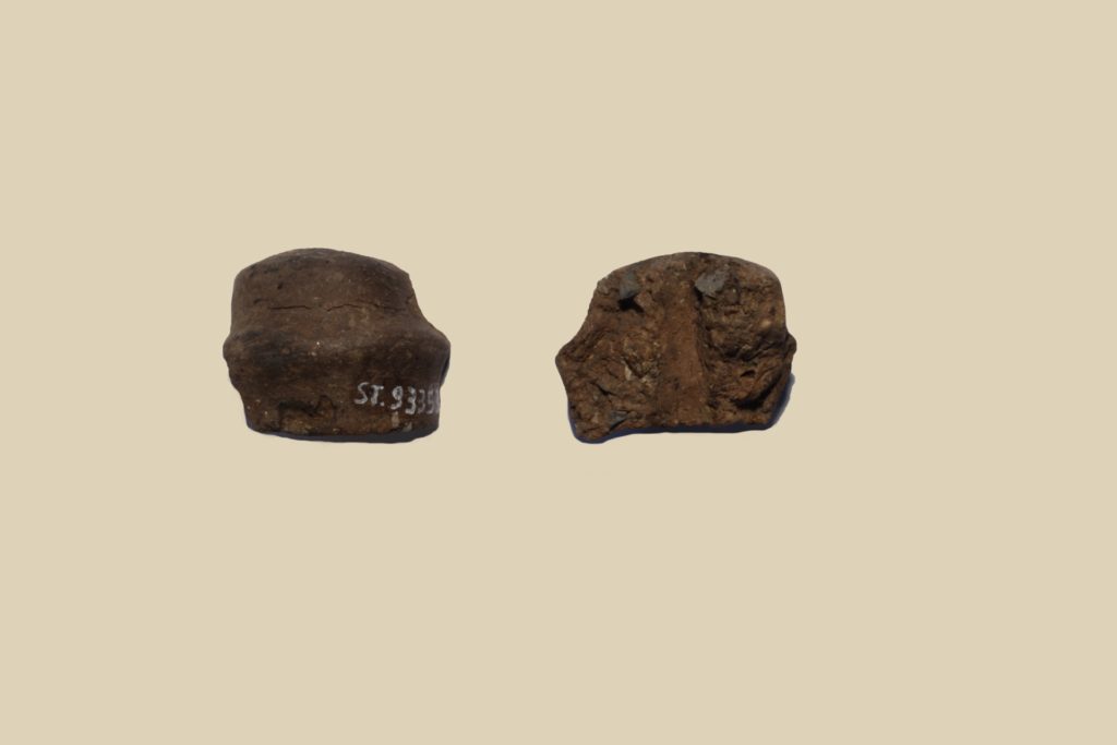 Fusaiola con basi a profilo convesso e concavo e cordonatura mediana a rilievo. Foro passante. Conservata per 1/2 circa. Ceramica eseguita a mano. Diametro 2.9 cm
