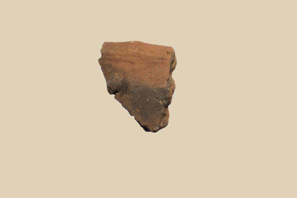 Si conserva un frammento di orlo indistinto con parete dritta decorata da una bugna plastica eseguita premendo l’argilla ancora cruda dall’interno verso l’esterno. Ceramica eseguita a mano.