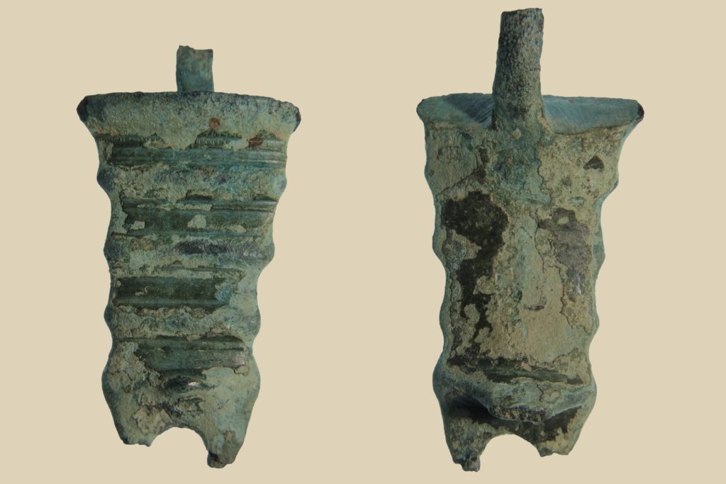 Le fibule di questo tipo presentavano una molla bilaterale e talora un elemento decorativo come un bottone in ambra.
